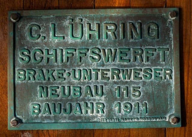 Restoration and conversion to her current rig took four years, with a huge amount of creative thinking and hard work. Saloon benches were salvaged from a church. Joinery timber for the accommodation came from a demolished bank. The new masts had previously been used to line oil wells. The beautiful teak deck had previously been a dance floor.