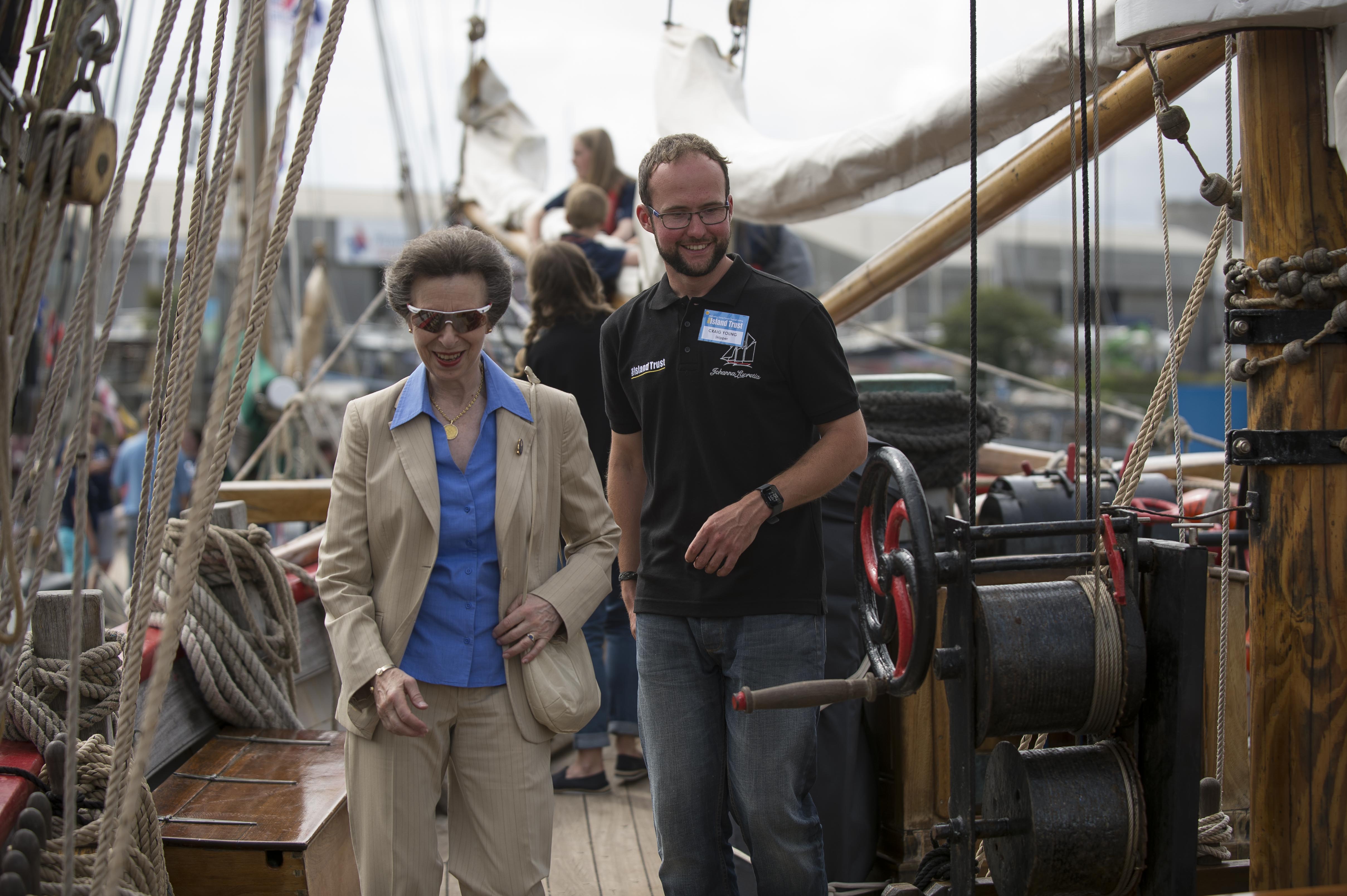 Her Royal Highness was escorted by Dick Lloyd to the pontoon to meet operations manager Tom Walker and Ocean Discoverability project manager John Hepburn. Tom invited Her Royal Highness to board each of the boats, all three looking stunning dressed overall, where she met our team of skippers and mates, and the young trainees who had just returned from a week’s sailing. Her Royal Highness spent time talking to the crews, and was interested in everyone and everything.