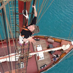 Whichever ship you’re on, you will need a climbing induction before you can shin up the rigging. Your first climb will be ‘buddied’, as an experienced member of deck crew will come with you. This is important, as not all the useful-looking hand-holds are safe to use. Many ships insist on a buddy system for all trips aloft. Ensure you listen carefully to the crew at all times when you are up the rigging. If you feel unsure about anything, always ask. There’s no such thing as a silly question!