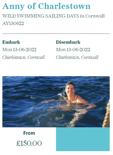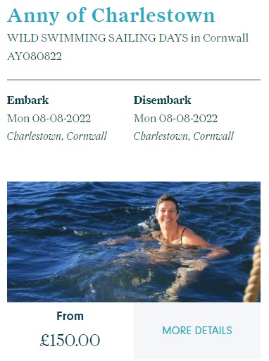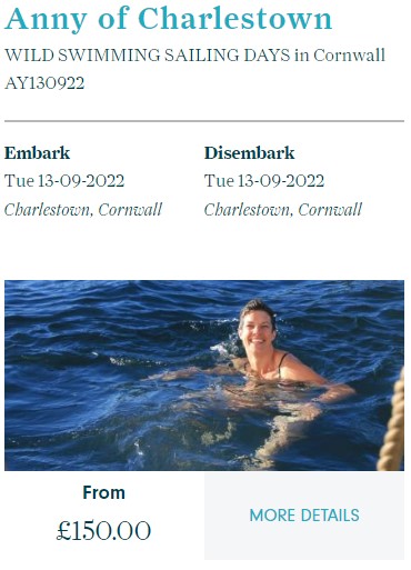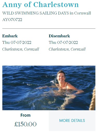 Wild Swimming sailing days from Charlestown Harbour aboard 1930 Topsail Schooner ‘Anny’. A unique perspective on the Cornish coastline, and a fantastic day out. You can be as involved as you like with the ship’s manoeuvres, with opportunities for helming and sail handling, or you can just sit back and enjoy the spectacle!