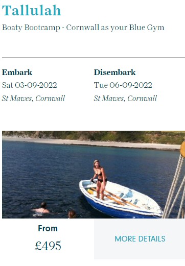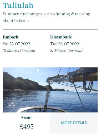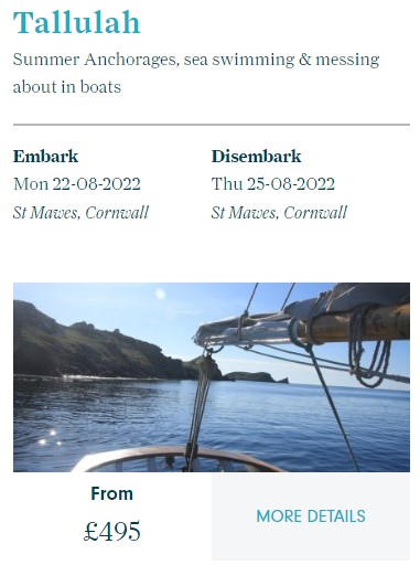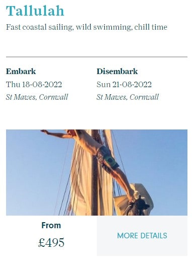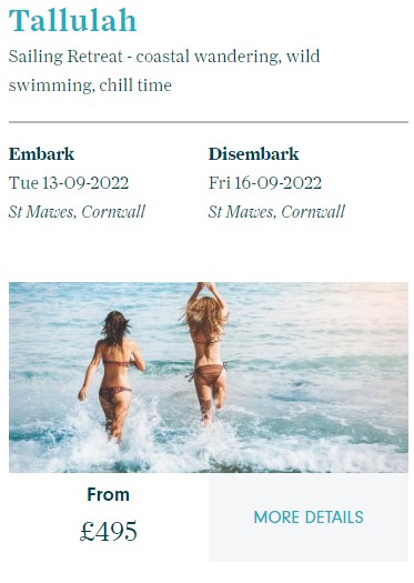 Tallulah has day sails, weekend breaks and voyages to the Isles of Scilly and on all of them it may be possible to wild swim.